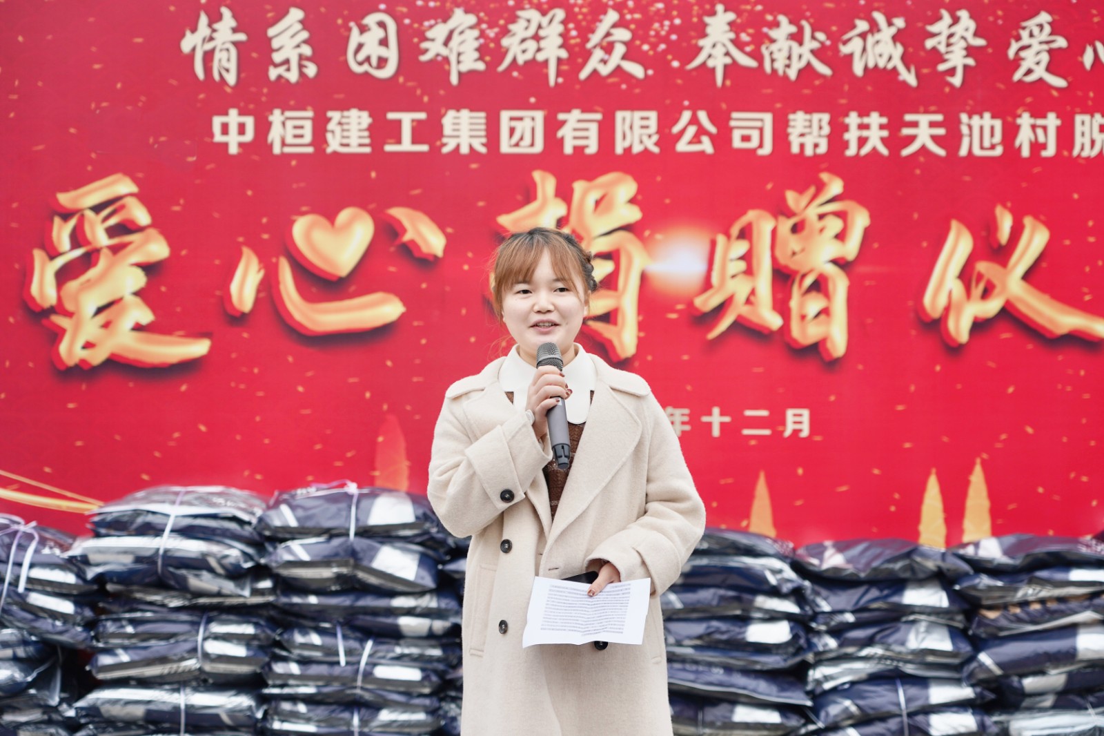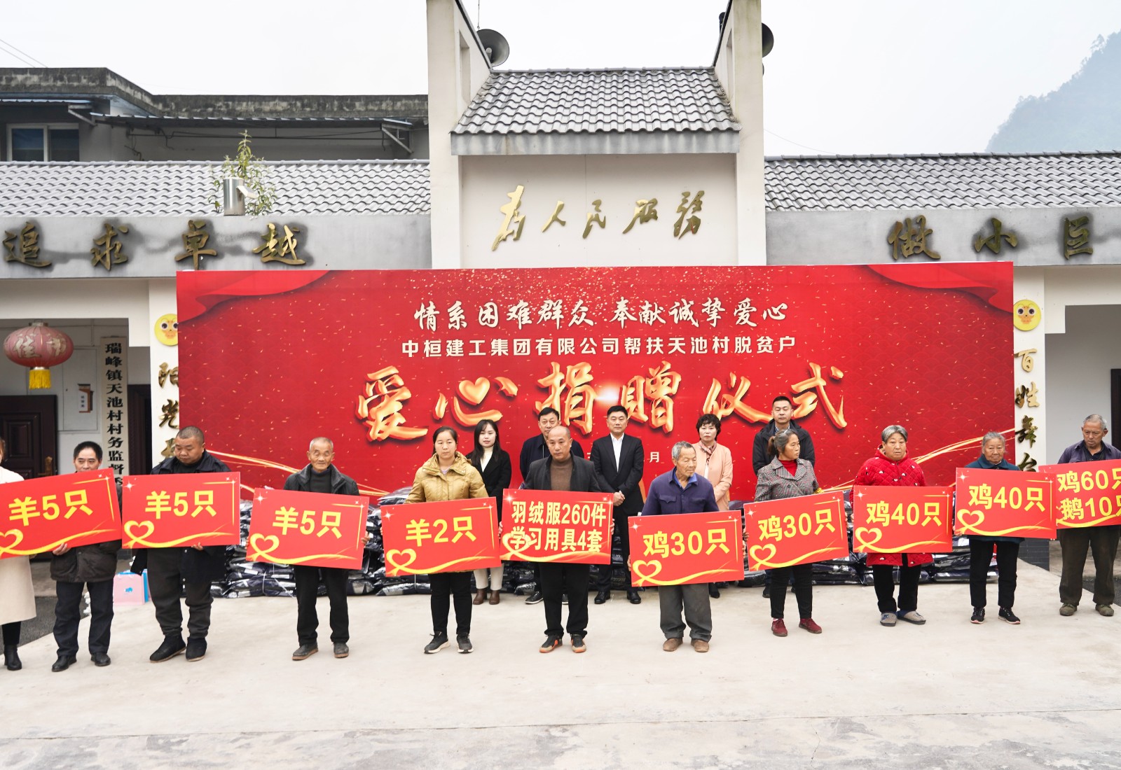 在青神縣人大常委會主任盧明春、青神縣紀委監委機關黨委書記劉巧茹、青神縣副縣長萬紅纓、青神縣瑞峰鎮黨委書記葛亞飛、青神縣瑞峰鎮鎮長熊菲、青神縣瑞峰鎮紀委書記張紅英以及天池村第一書記李蓉帶領的班子成員、各社社長的共同見證下,中桓建工為困難家庭送上17只養殖母羊,250只養殖雞、10只養殖鵝,為脫貧戶捐贈260件棉衣及學習用具4套。希望這些物資能讓大家感覺寒冬有暖,“錢”路有光。為了讓光照的更遠,中桓建工董事長魏一平表示,愿意每年初免費為天池村村民提供小雞、奶豬,呼吁村民們養殖糧食雞、糧食豬,待年終時中桓建工以高于市場價的價格向大家收購。
